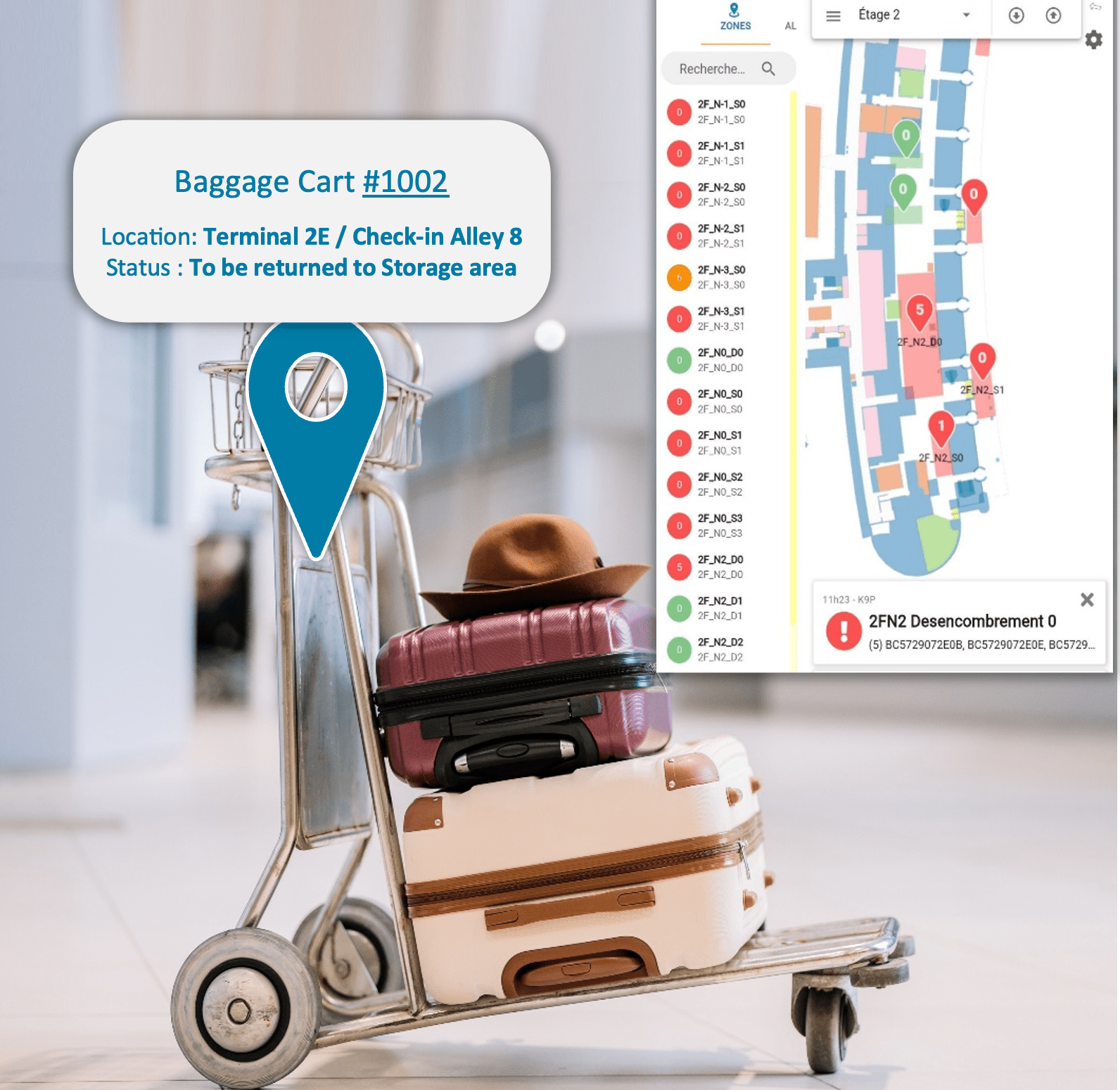 Zone-based asset tracking allows airports to digitally define key operational areas such as check-in counters, security exits, boarding gates and storage zones. Automated asset counting within each zone ensures that cart availability is continuously monitored.